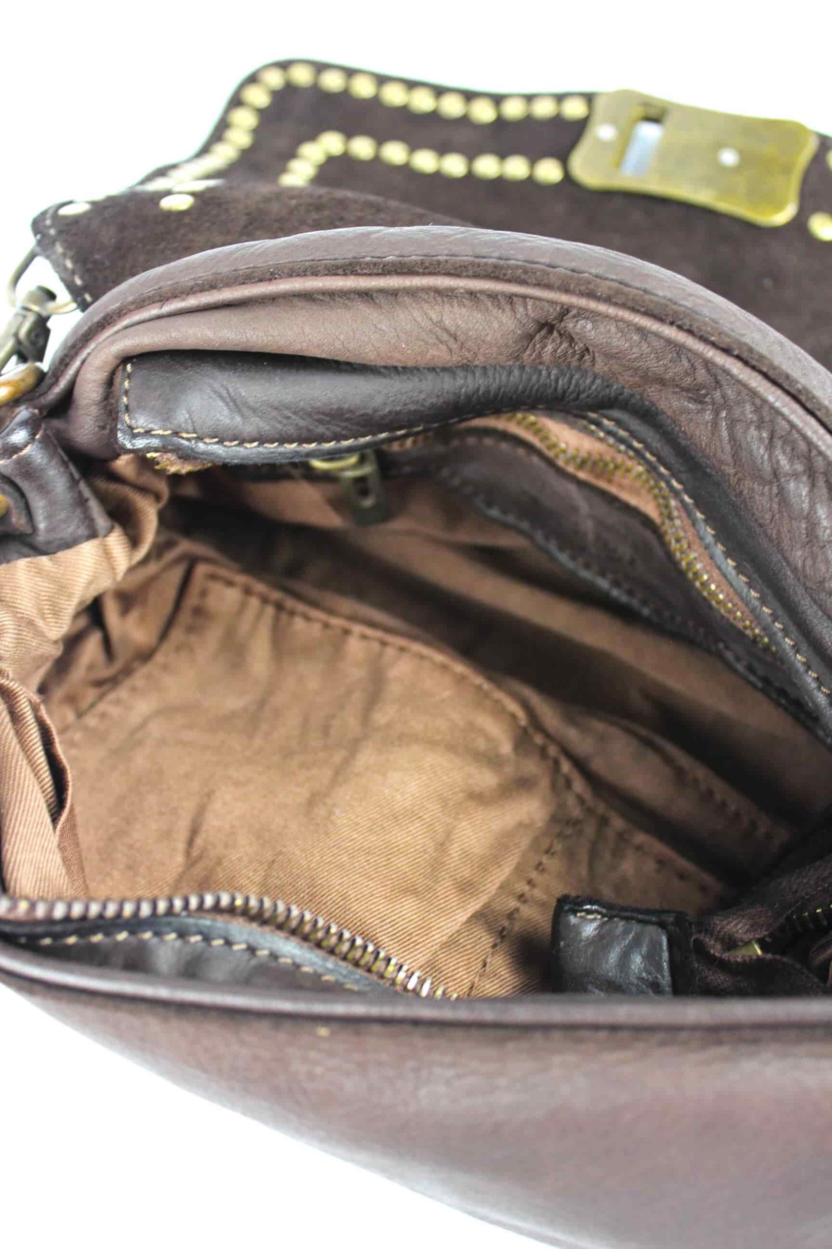 - Cierre de solapa con pasador dorado y cremallera en interior