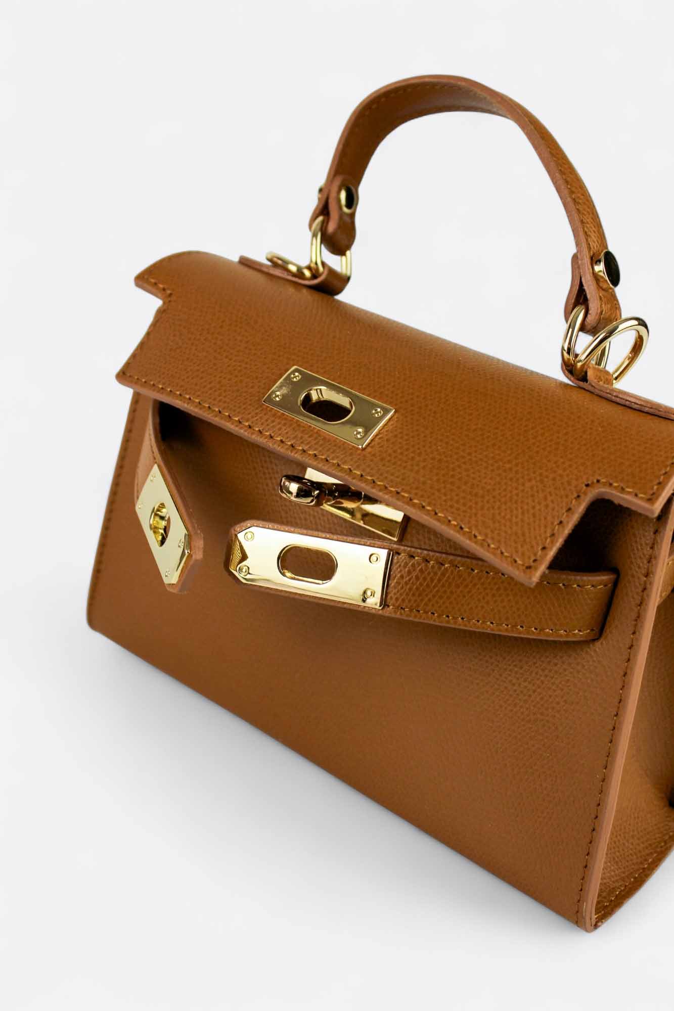 Bolso pequeño de piel Saffiano fabricado en Italia por nuestros maestros peleteros, de la mejor calidad. La piel saffiano se caracteriza por su distintivo patrón de líneas cruzadas y un acabado encerado, lo que le confiere una gran durabilidad y además, su textura rígida ayuda a mantener la forma del bolso, lo que le hace aún más elegante.