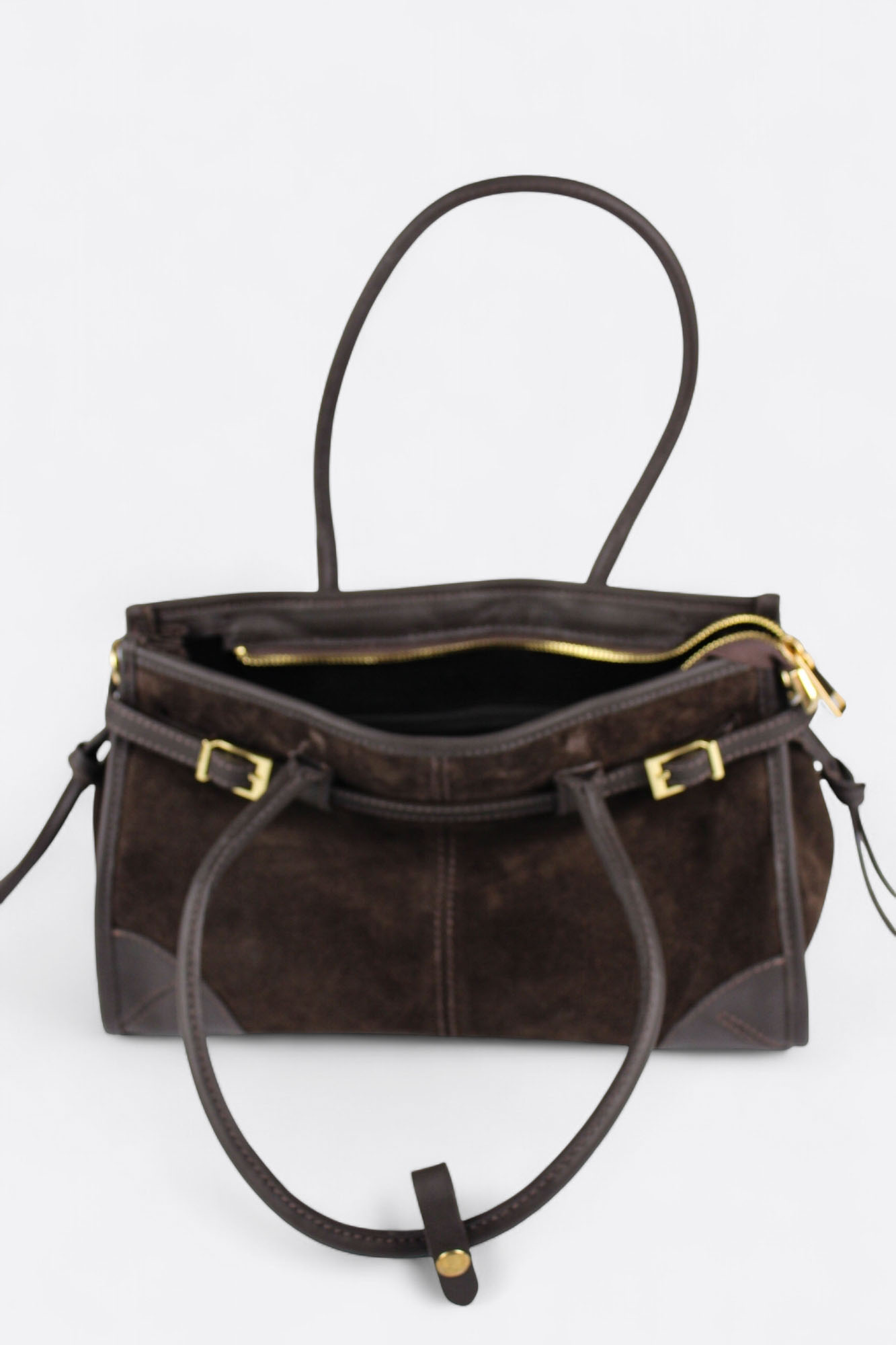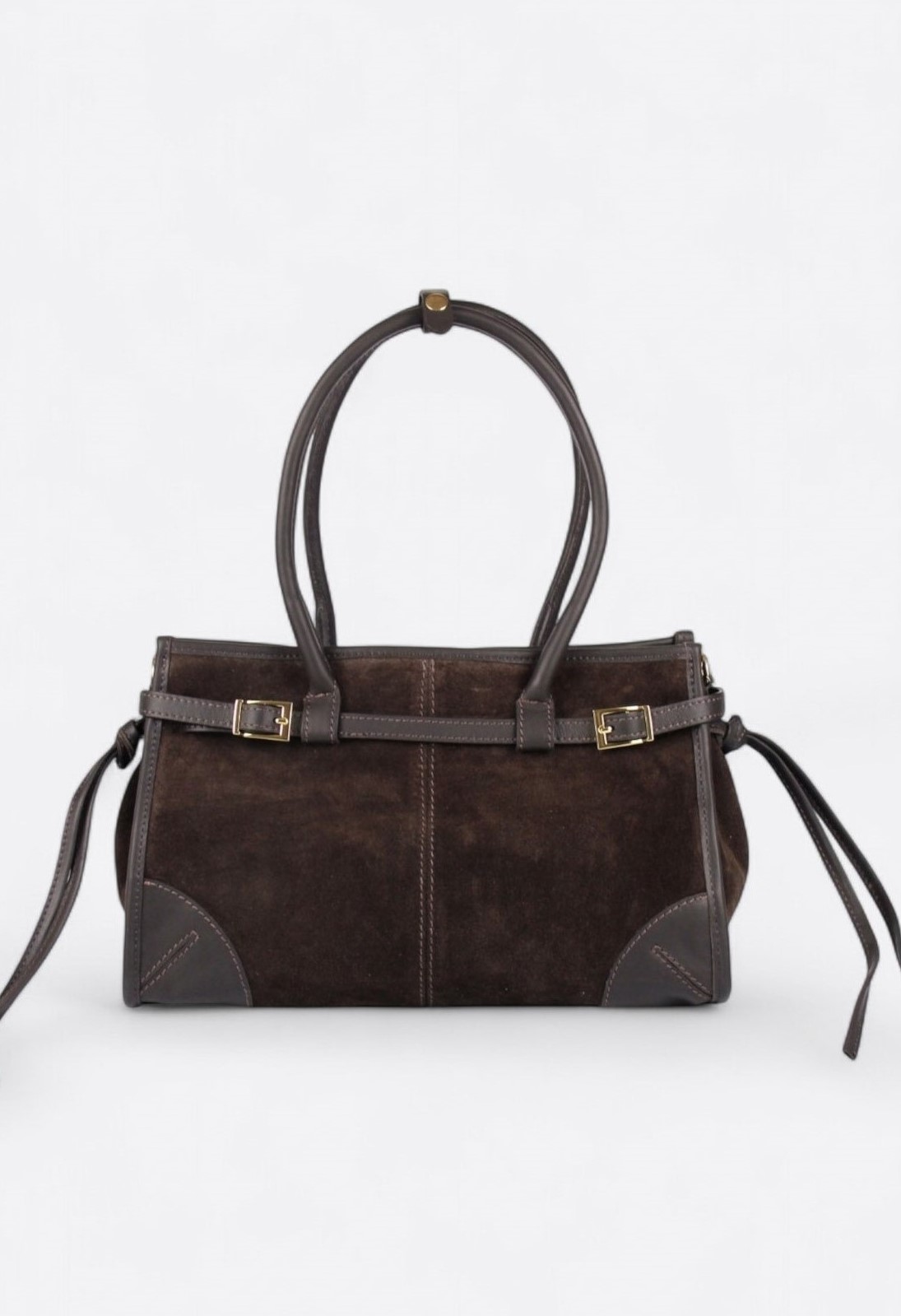 Bolso de Hombro Estructurado de Ante con Hebillas Doradas