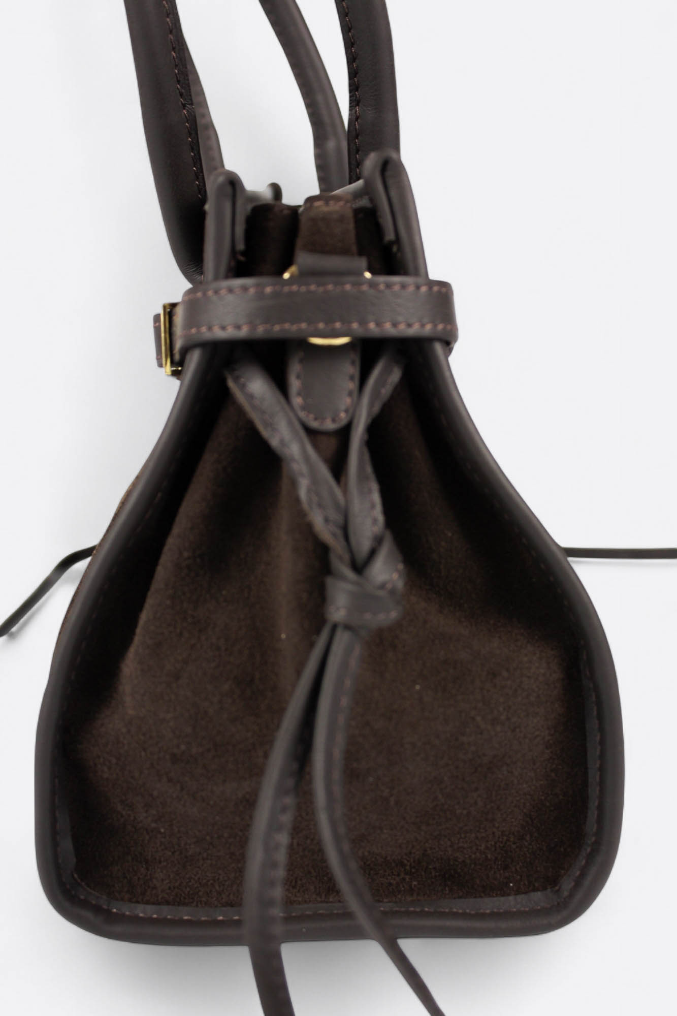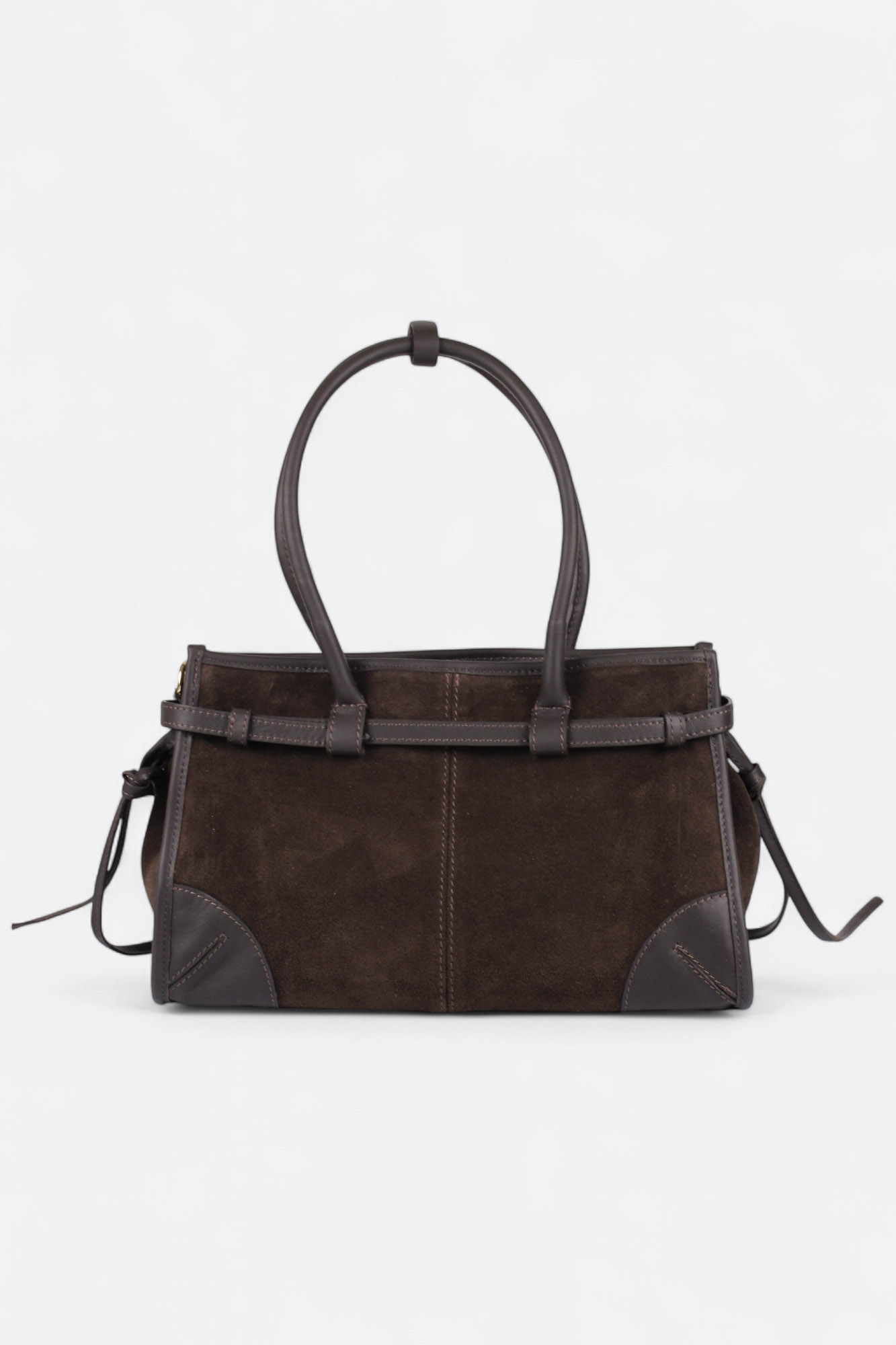 Este bolso ha sido diseñado para la mujer urbana que busca calidad y diseño en un solo producto. Se presenta como un impecable bolso de ante estructurado tipo Satchel con detalles en piel lisa en las esquinas, las asas, los cordones laterales y la correa con hebillas que lo rodea. Ideal para el día a día.